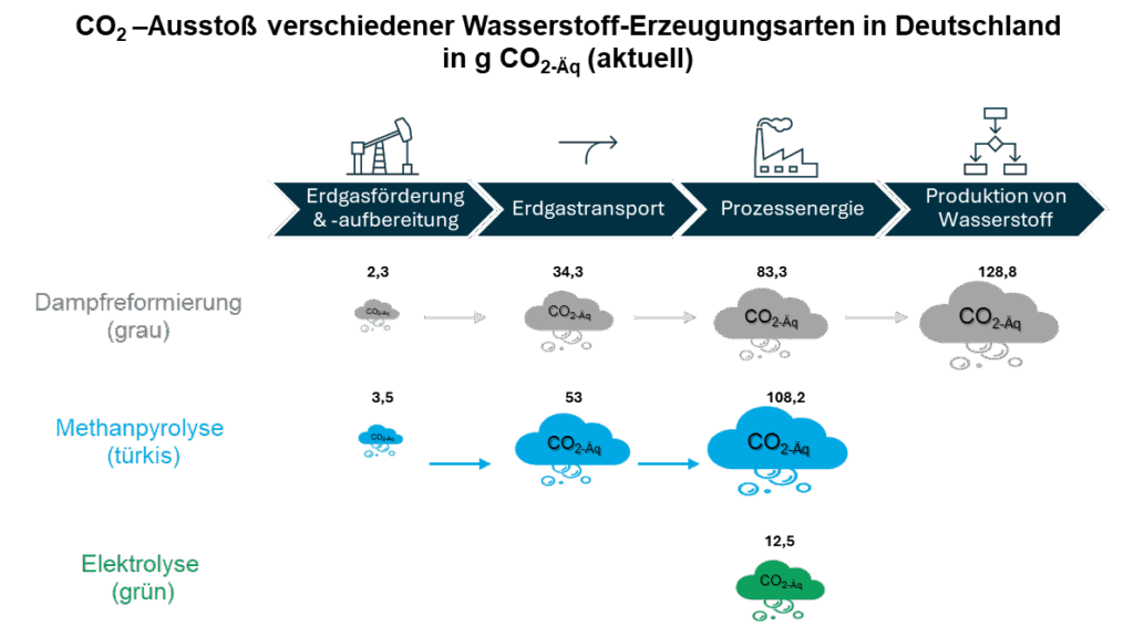 Die Grafik zeigt, wie unterschiedlich der CO2-Ausstoß je nach Art der Wasserstofferzeugung ausfällt – von der Erdgasförderung bis zur eigentlichen Produktion. Es wird deutlich, dass Wasserstoff ist nicht automatisch klimaneutral ist, sondern nur so sauber wie seine Herstellungsweise. Für die Zukunft bedeutet das große Chancen, wenn vor allem grüner Wasserstoff aus erneuerbarem Strom ausgebaut wird. Herausforderungen gilt es ebenfalls zu bewältigen, etwa beim schnellen Ausbau von Ökostrom, beim Aufbau der Infrastruktur und bei den Kosten der Umstellung.