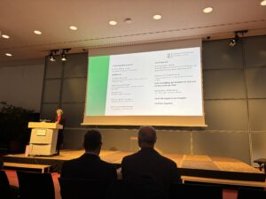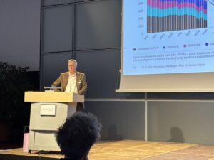 Die Keynote hielt Prof. Markus Hölzle, Vorstandsmitglied des Zentrums für Sonnenenergie- und Wasserstoff-Forschung Baden-Württemberg (ZSW) und Vorstandsmitglied unseres Vereins H2-Wandel. Unter dem Titel: „Grüner Wasserstoff und grüne Elektronen – auf zwei Beinen steht die Energiewende besser“ führte er den Gästen vor Augen, was in Deutschland und vor allem in Baden-Württemberg mit Blick auf das Ziel der Klimaneutralität inzwischen alles erreicht wurde. Trotz etlicher Kehrtwenden auf politischer Ebene, trotz aller herausfordernden Entwicklungen der regionalen und globalen Märkte: Es geht mit der Energiewende voran, machte Prof. Hölzle klar: Der Ausbau der Erneuerbaren Energien läuft zügig, große Batteriespeicher werden aufgebaut, und Wasserstoff erobert sich in diesem Szenario nach und nach seinen Platz.