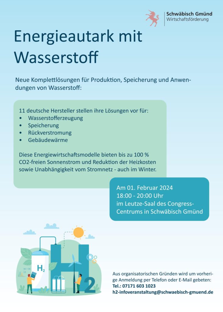 Die Stadt Schwäbisch Gmünd lädt Bürger und Unternehmer für den 1. Februar zur Abendveranstaltung „Wasserstofferzeugung und –anwendungen: mit Wasserstoff zur Energieautarkie“ ein. Sie bietet den Teilnehmern die Gelegenheit, sich über diesen nachhaltigen Energieträger und dessen Einsatzmöglichkeiten zu informieren.